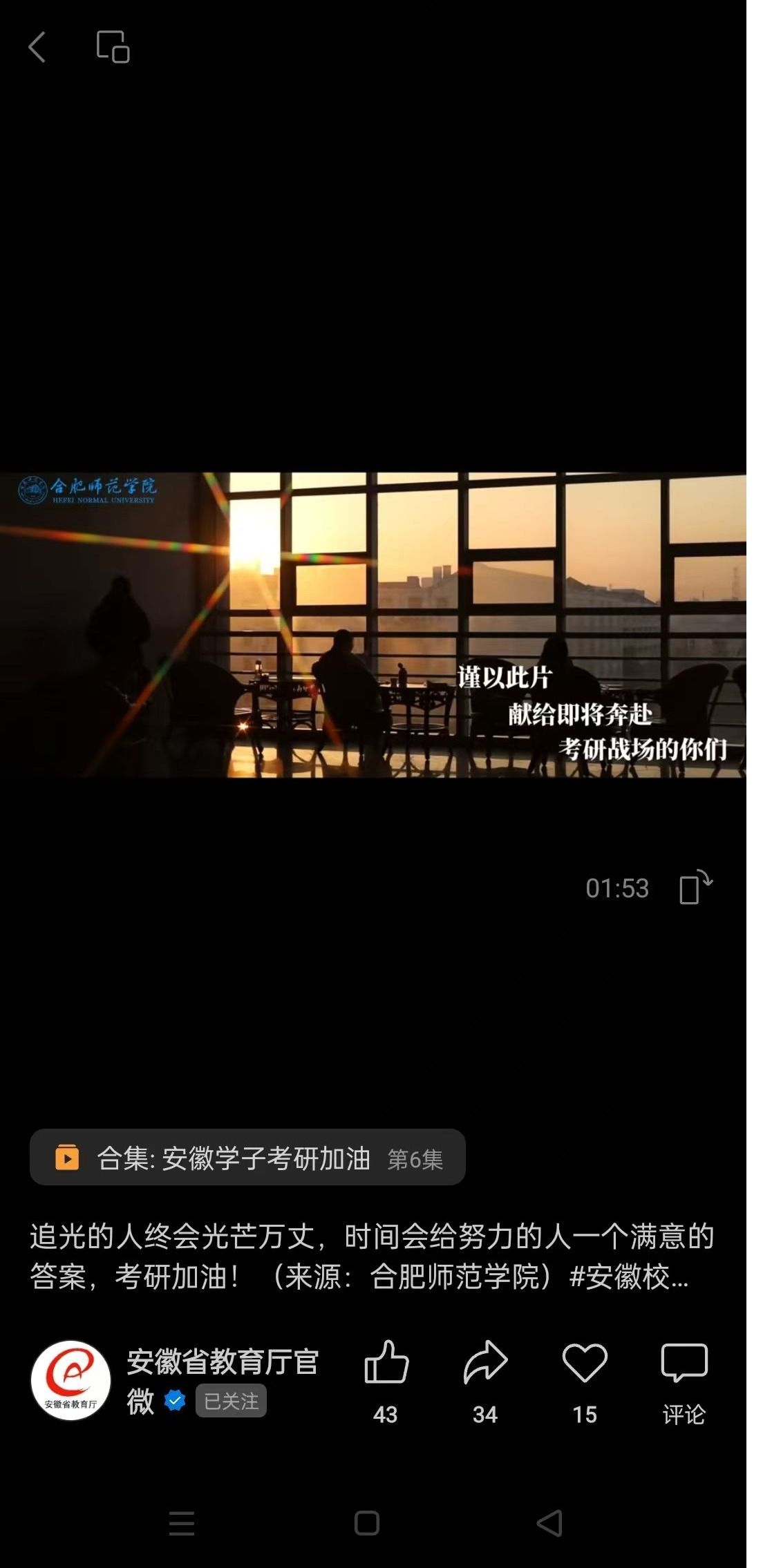 12月18日,安徽省教育厅官微视频号发布beat365学子考研主题宣传视频,为合师考研学子加油助力。(宣传部)