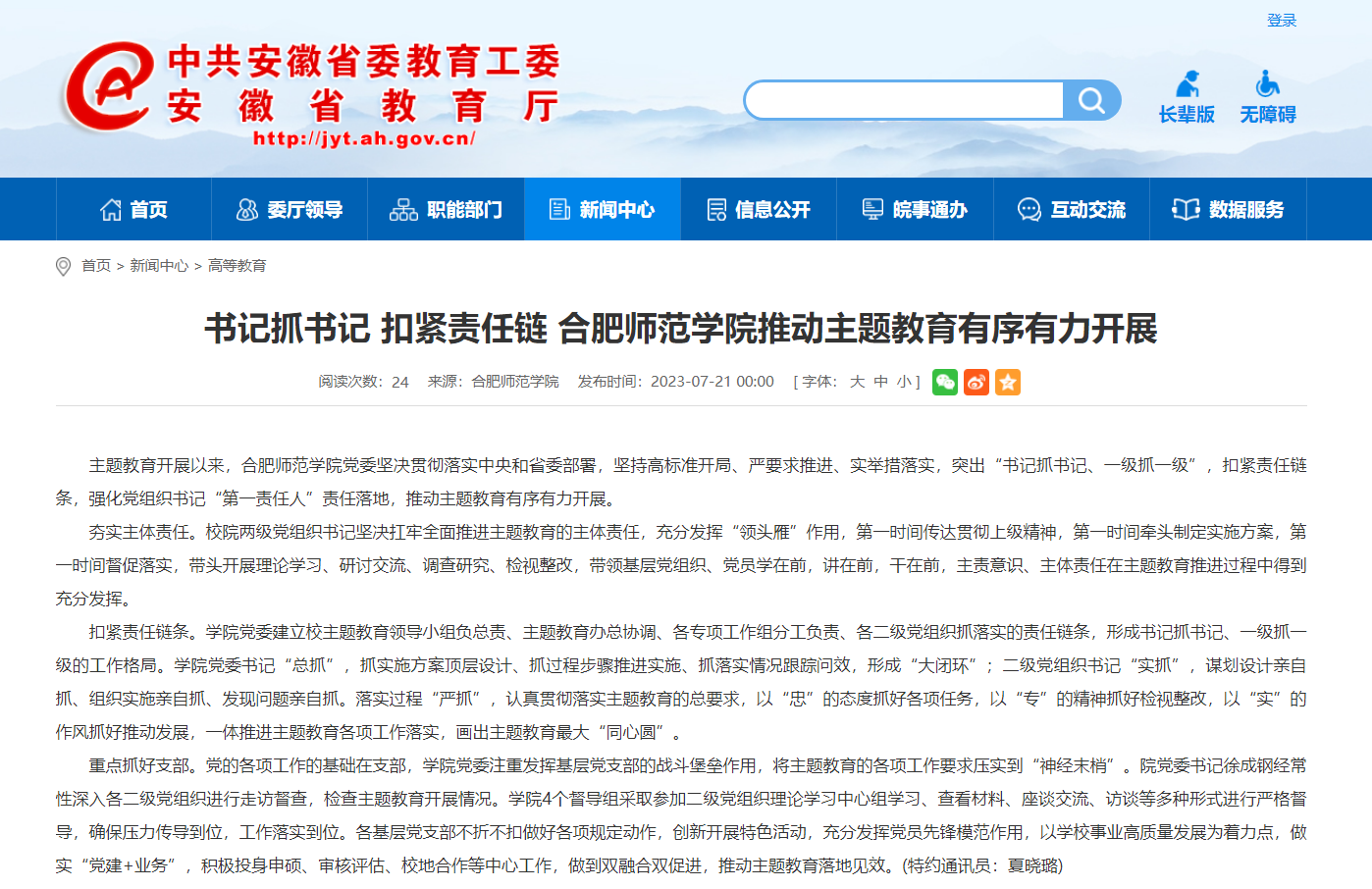 7月21日,安徽教育网以《书记抓书记 扣紧责任链 beat365唯一官方网站推动主题教育有序有力开展》为标题,对此进行了报道。