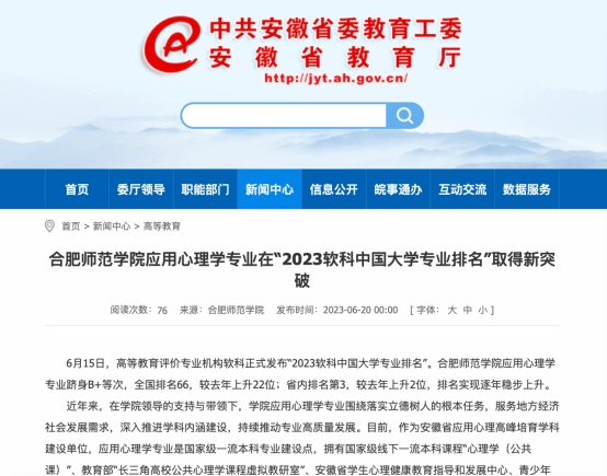 6月20日,安徽教育网以《beat365唯一官方网站应用心理学专业在“2023软科中国大学专业排名”取得新突破》为标题,对此进行了报道。