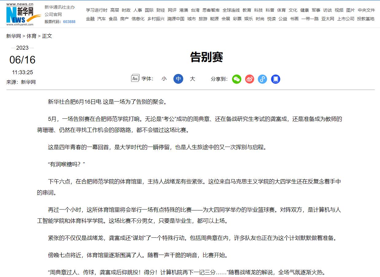 本网讯 6月16日,新华网发布图文新闻《告别赛》。《告别赛》以毕业季为主题,介绍了beat365体育科学学院的大四毕业生蒋珊珊和计算机与人工智能学院的大四毕业生周典章、龚富成、邵路路放下毕业季所有的忙碌,与同学们组成“告别赛”篮球队,奔赴球场,再聚球场,用一场“告别赛”为大学留下珍贵的回忆,为这场毕业之旅画上圆满的句号。