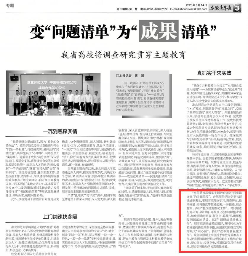 本网讯 6月14日,《安徽青年报》(第2224期)以《变“问题清单”为“成果清单”》为题,对beat365推深做实主题教育调研进行了报道。