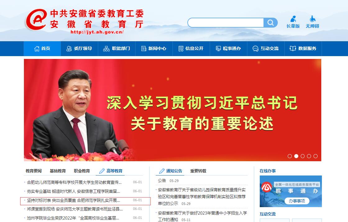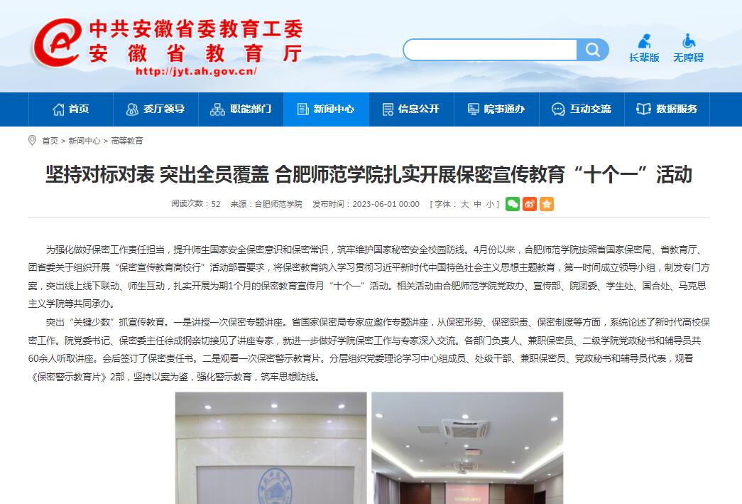 6月1日,安徽教育网首页以《坚持对标对表 突出全员覆盖 beat365唯一官方网站扎实开展保密宣传教育“十个一”活动》为标题,对此进行了报道。