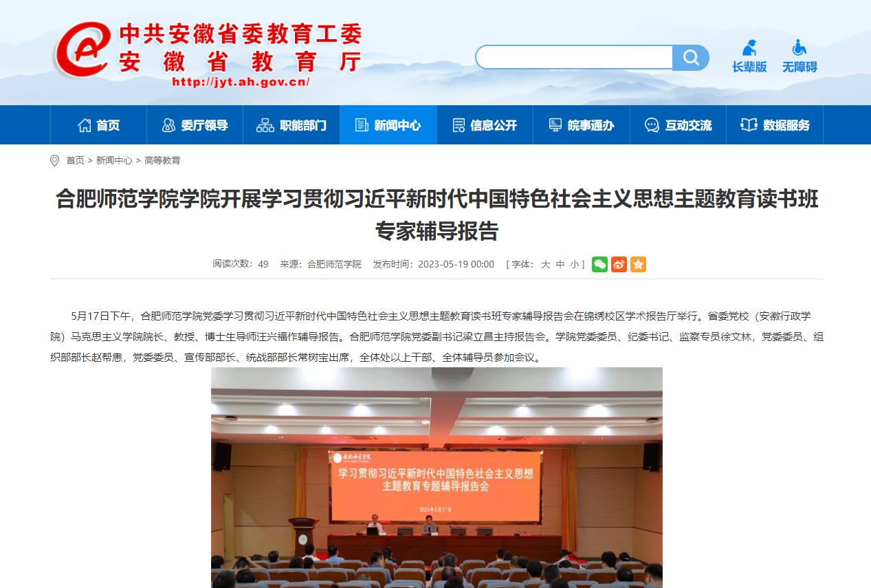 5月19日,安徽教育网以《beat365唯一官方网站学院开展学习贯彻习近平新时代中国特色社会主义思想主题教育读书班专家辅导报告》为标题,对此进行了报道。