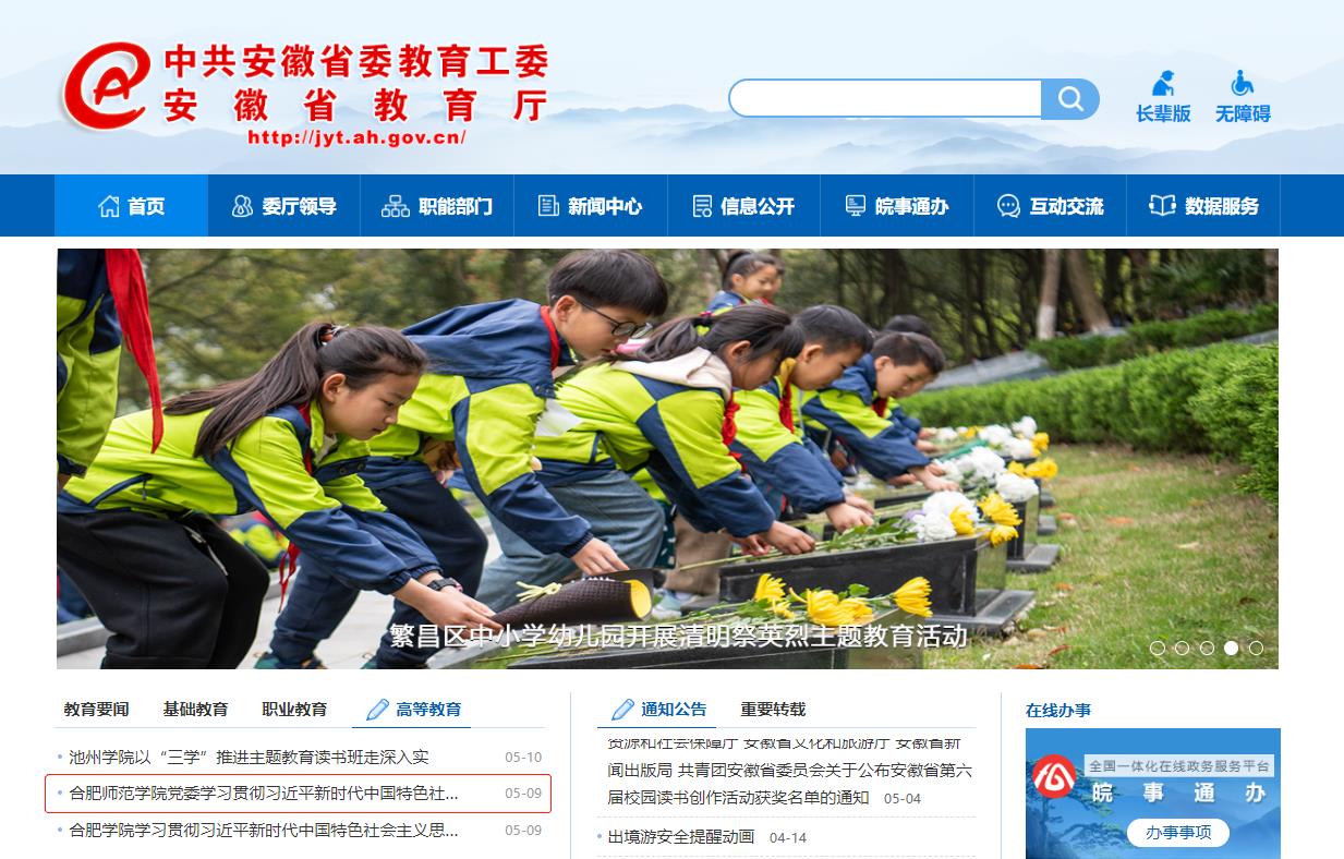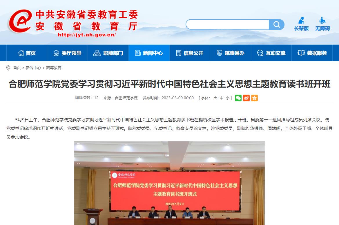 5月10日,安徽教育网首页以《beat365唯一官方网站党委学习贯彻习近平新时代中国特色社会主义思想主题教育读书班开班》为标题,对此进行了报道。