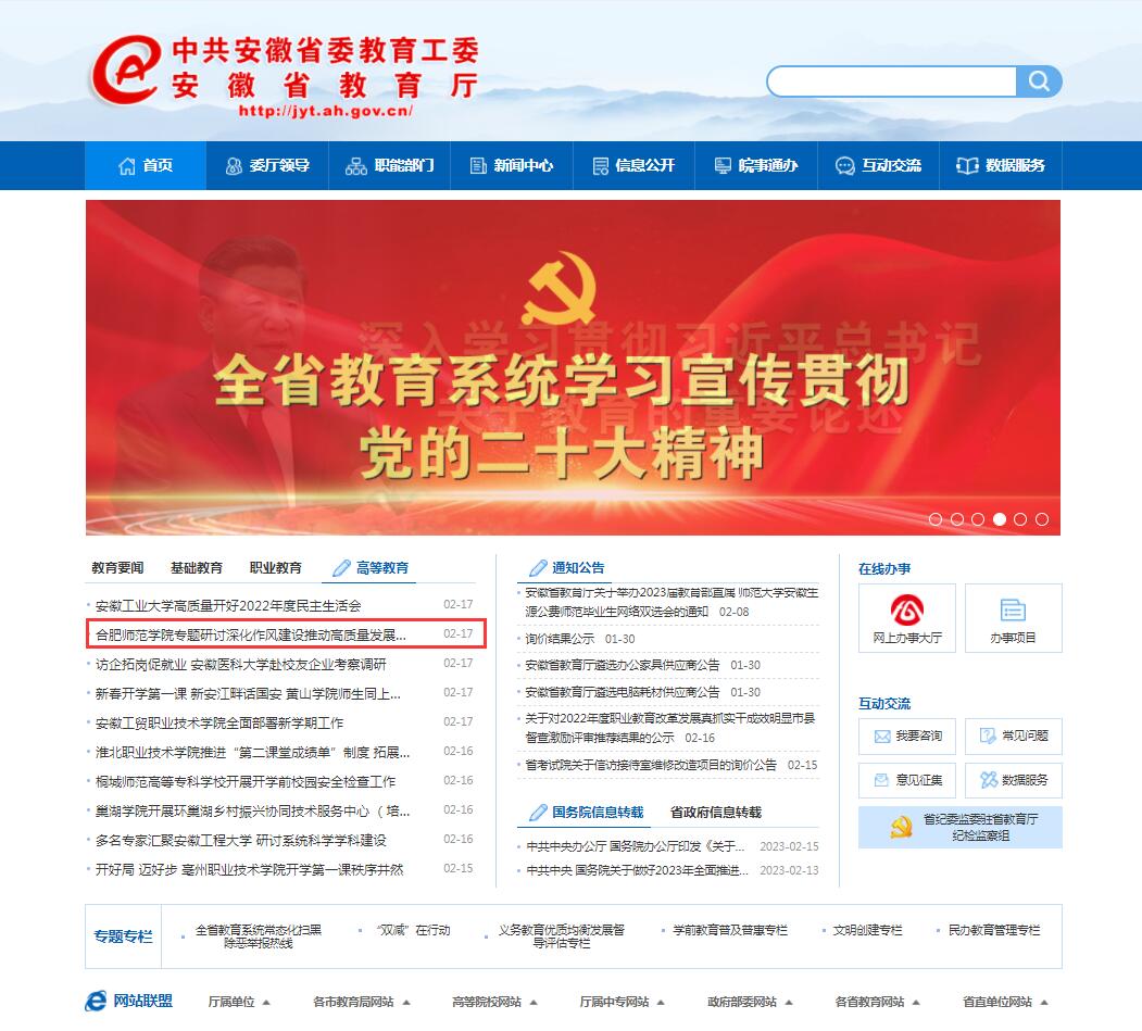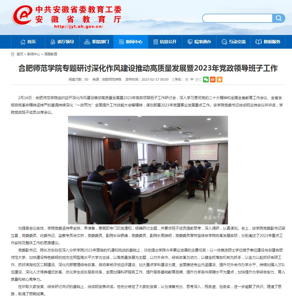2月17日,安徽教育网首页以《beat365唯一官方网站专题研讨深化作风建设推动高质量发展暨2023年党政领导班子工作》为标题,对此进行了报道。