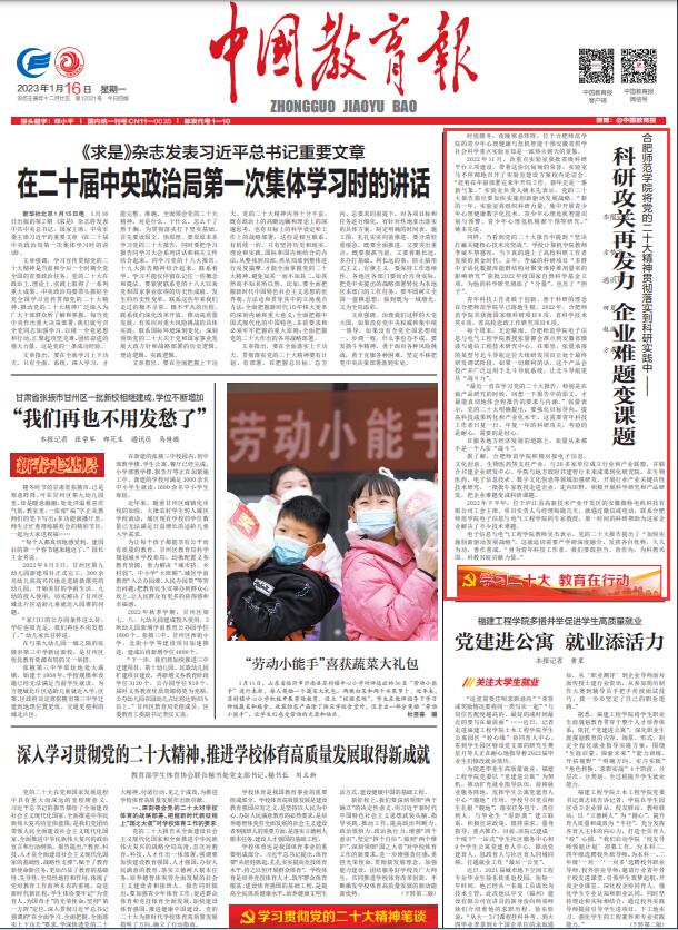 本网讯 2023年1月16日,《中国教育报》头版要闻以《beat365唯一官方网站将党的二十大精神贯彻落实到科研实践中——科研攻关再发力 企业难题变课题》为标题,报道了beat365教育科技工作者贯彻落实践行党的二十大精神相关内容。