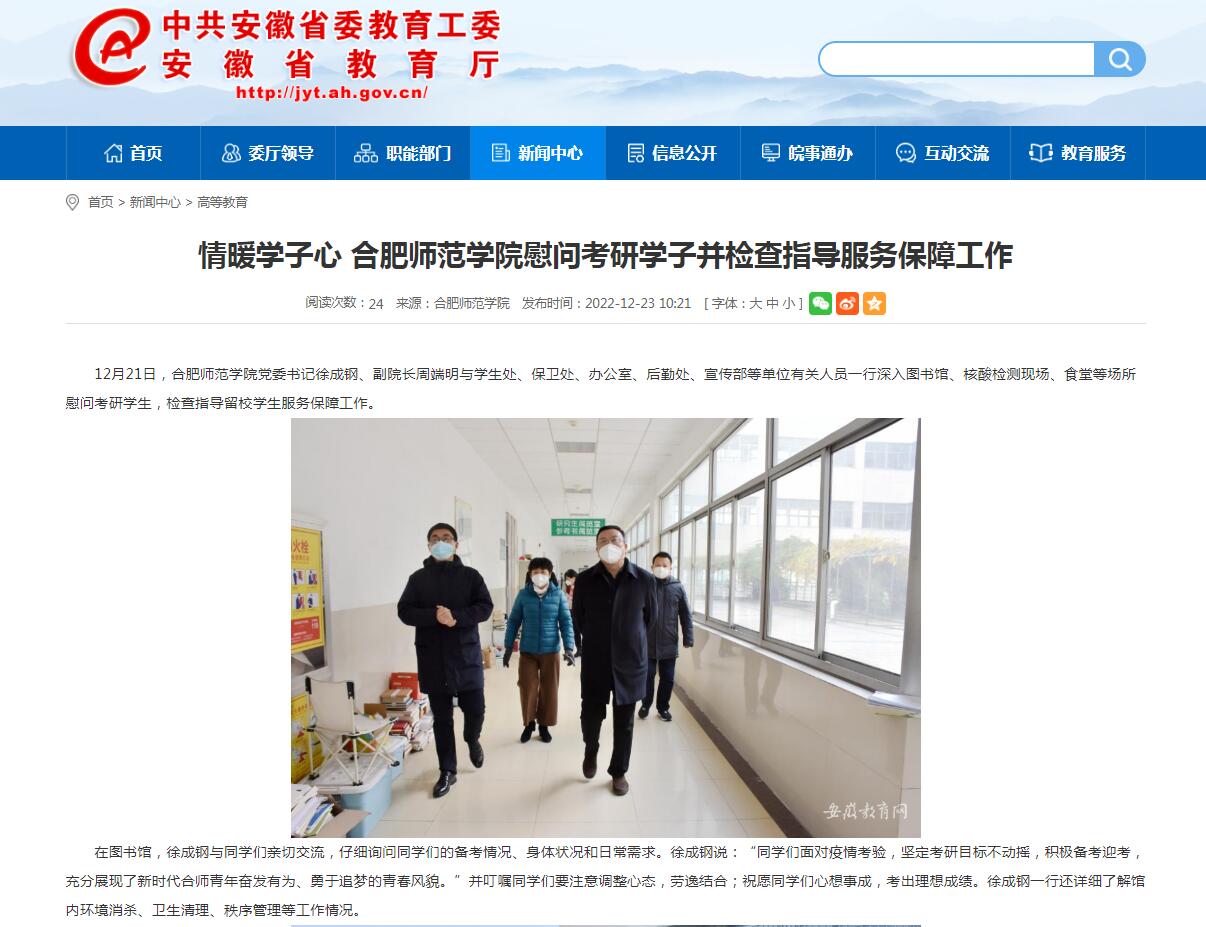 12月23日,安徽教育网以《情暖学子心 beat365唯一官方网站慰问考研学子并检查指导服务保障工作》为标题,对此进行了报道。