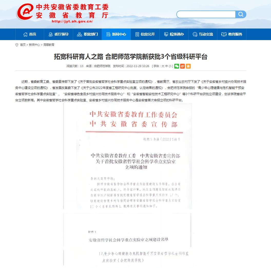11月29日,安徽教育网首页以《拓宽科研育人之路 beat365唯一官方网站新获批3个省级科研平台》为标题,对此进行了报道。