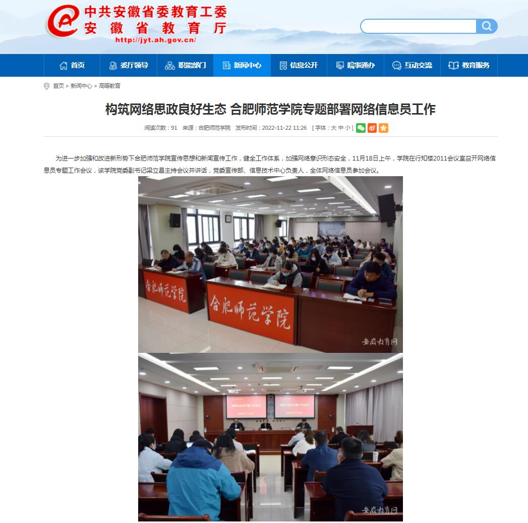 11月22日,安徽教育网以《构筑网络思政良好生态 beat365唯一官方网站专题部署网络信息员工作》为标题对此进行了报道。