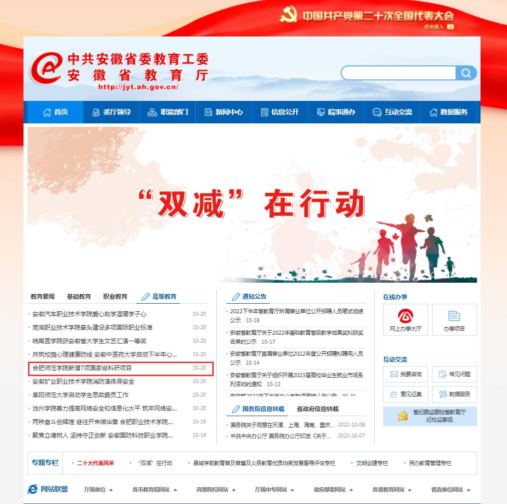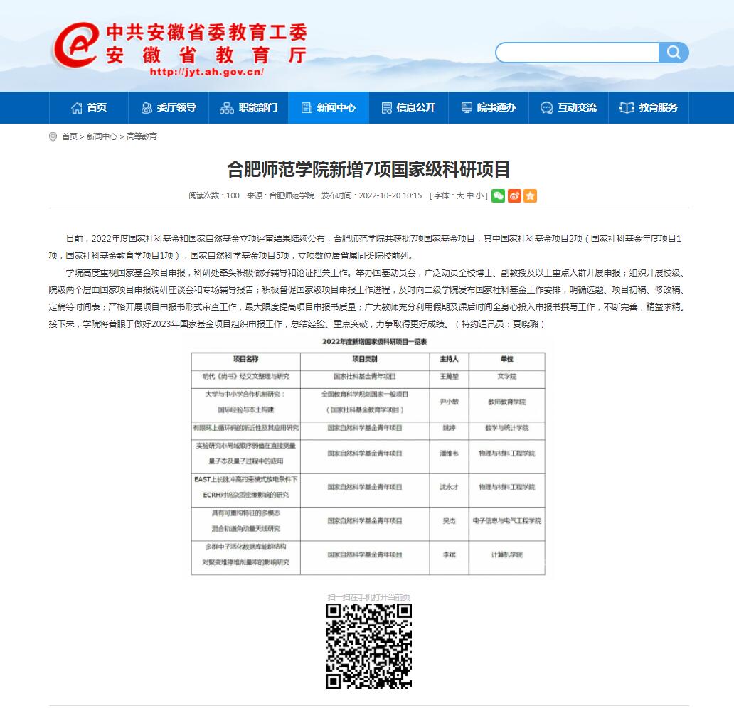 10月20日,安徽教育网首页以《beat365唯一官方网站新增7项国家级科研项目》为标题进行了报道。