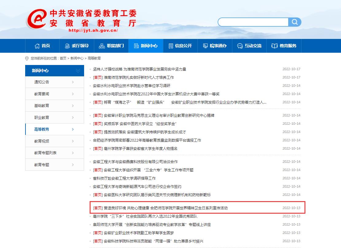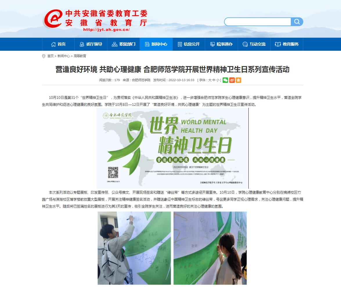 10月13日,安徽教育网首页以《营造良好环境 共助心理健康 beat365唯一官方网站开展世界精神卫生日系列宣传活动》为标题进行了报道。