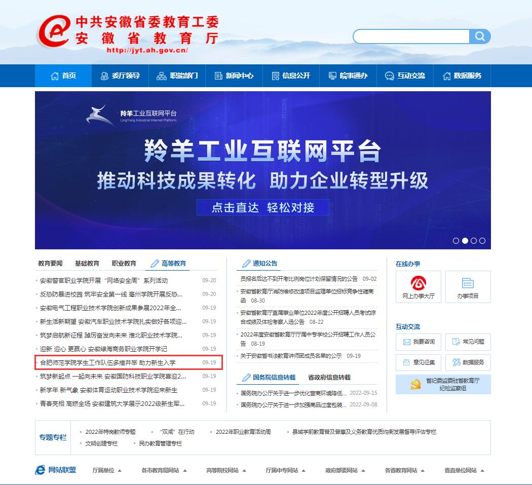 9月19日,安徽教育网首页以《beat365唯一官方网站学生工作队伍多措并举 助力新生入学》为标题进行了报道。