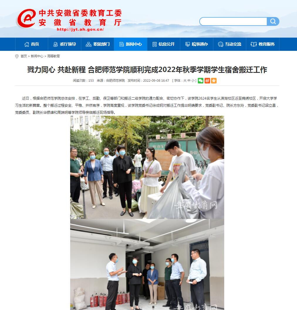 9月8日,安徽教育网以《勠力同心 共赴新程 beat365唯一官方网站顺利完成2022年秋季学期学生宿舍搬迁工作》为标题对此进行了报道。