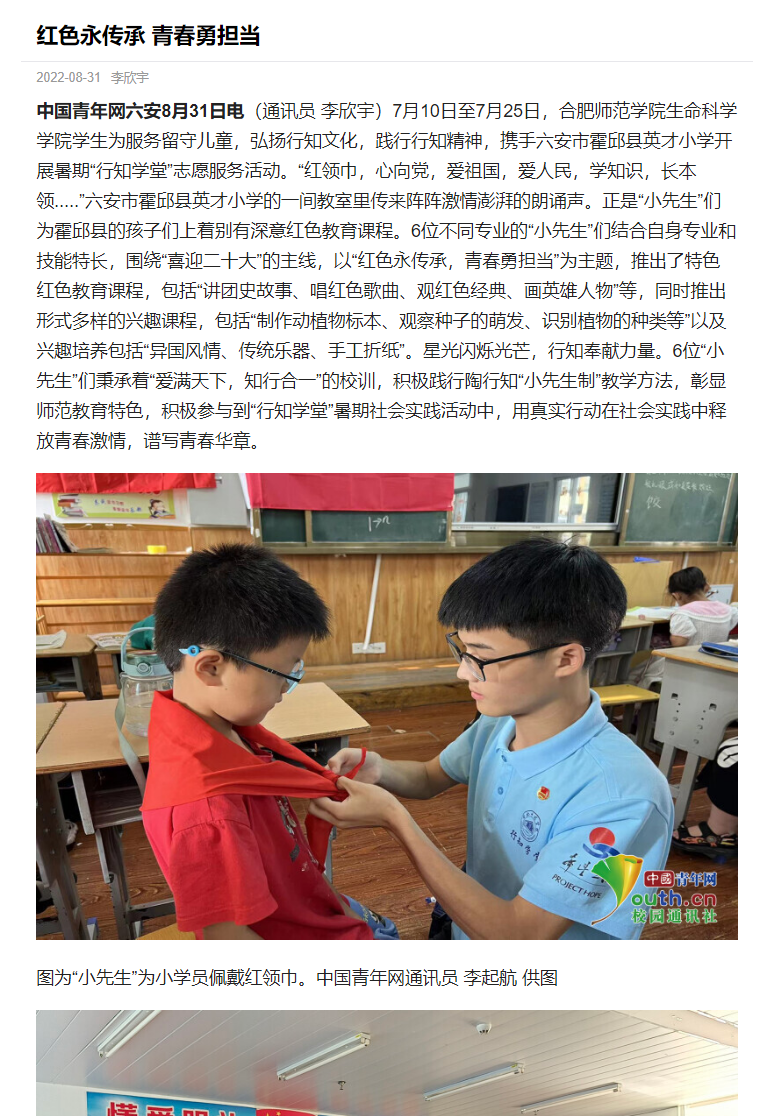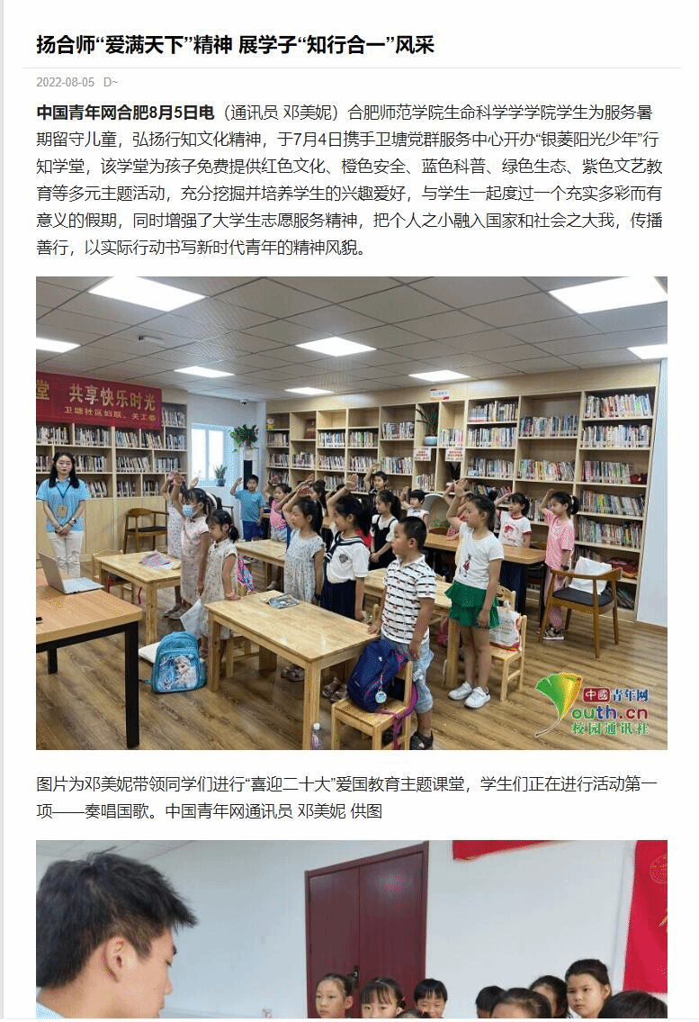 本网讯 为进一步发扬行知精神,弘扬行知文化,培养当代大学生社会责任感,生命科学学院积极动员学生参加“行知学堂”暑期实践活动,学生热情高涨。三个团队受到了《中国青年网》媒体的报道,其中包括卫塘社区“银菱阳光少年”行知学堂、合肥市蜀山区芙蓉社区行知学堂、六安霍邱县行知学堂。