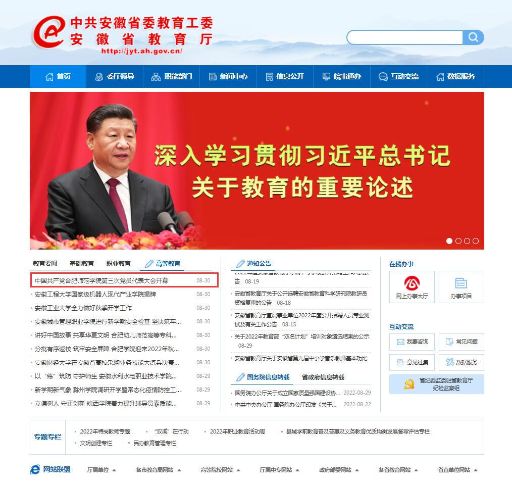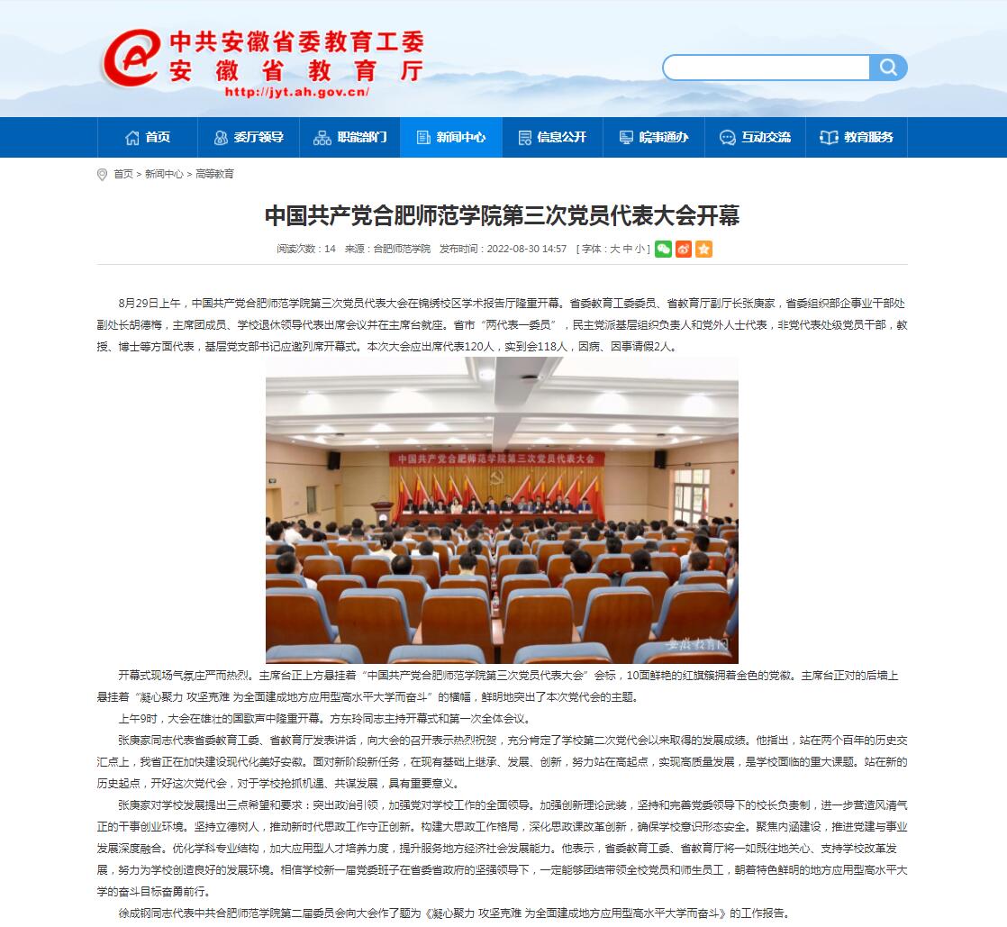 8月30日,安徽教育网首页以《中国共产党beat365唯一官方网站第三次党员代表大会开幕》为标题进行了报道。