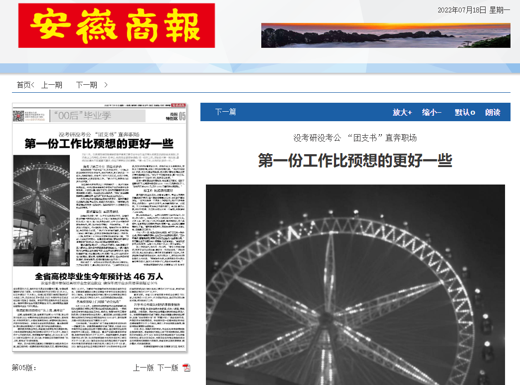 本网讯 近日,安徽商报以《没考研没考公 “团支书”直奔职场》为题,专题报道了beat365电子信息与电气工程学院电子信息工程专业毕业生洪万里同学的求职故事。