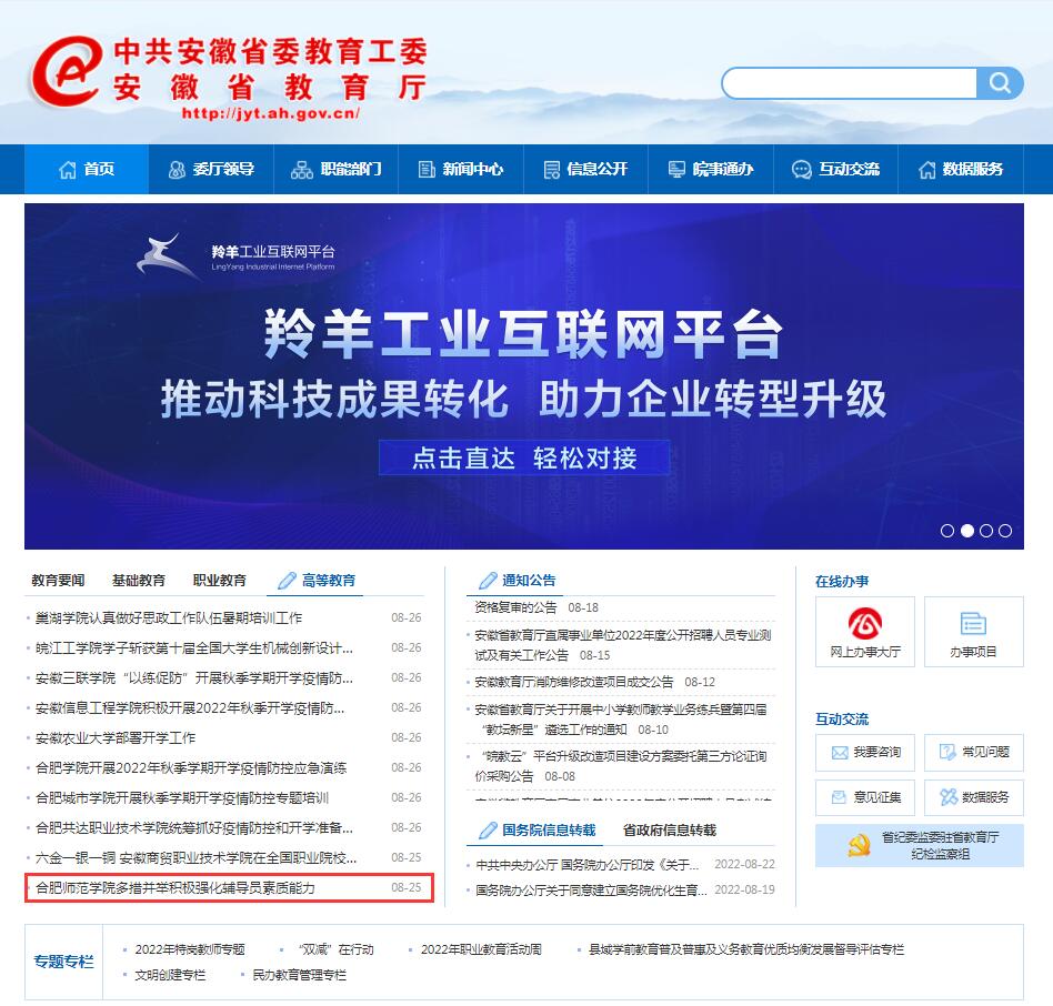 8月25日,安徽教育网首页以《beat365唯一官方网站多措并举积极强化辅导员素质能力》为标题进行了报道。