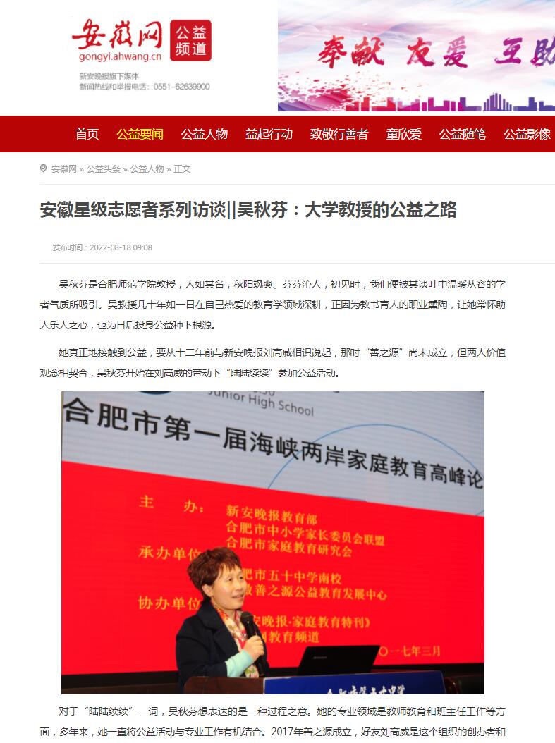 8月18日,安徽网以《安徽星级志愿者系列访谈‖吴秋芬:大学教授的公益之路》为题,对吴秋芬教授进行了报道。