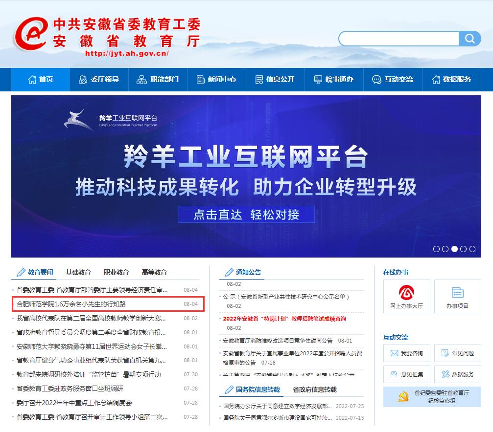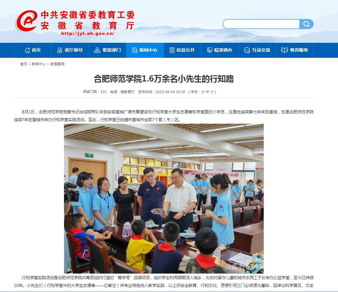 8月4日,安徽教育网首页教育要闻栏目以《beat365唯一官方网站1.6万余名小先生的行知路》为标题,对此进行了报道。(院团委)