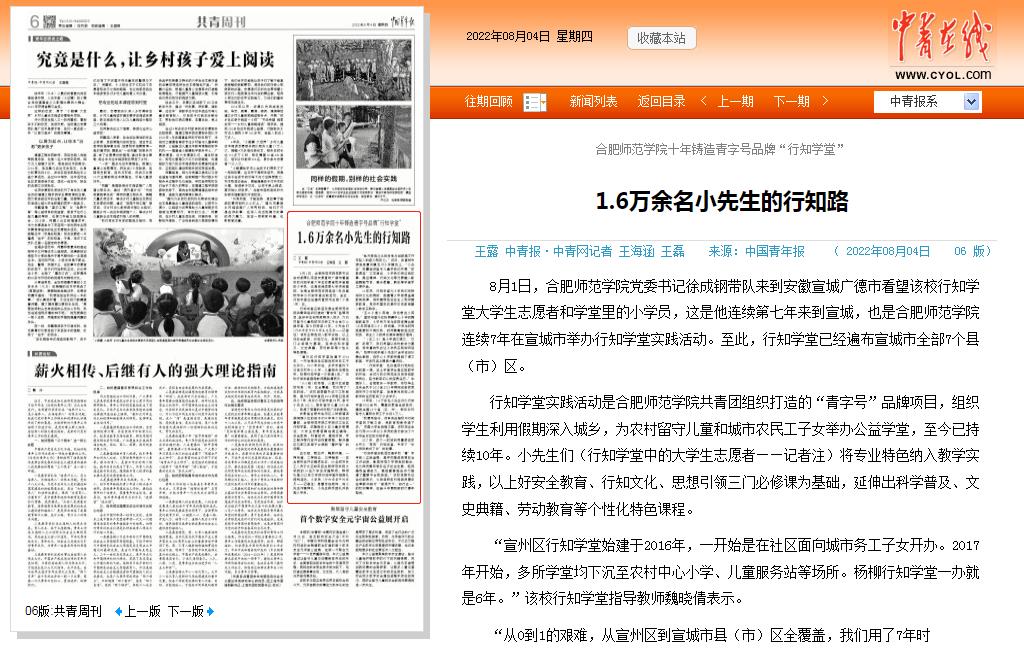 本网讯 8月4日,《中国青年报》(06版)以《beat365唯一官方网站十年铸造青字号品牌“行知学堂”:1.6万余名小先生的行知路》为题,报道了我院“行知学堂”实践活动十周年历程。报道介绍了学院连续7年在宣城市举办行知学堂实践活动经历,以及十年来“行知学堂”实践活动中涌现出的基地学堂、特色课程、典型人物等事迹。