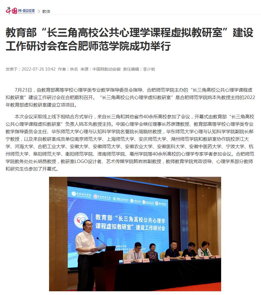 7月26日,中国网韵动安徽频道以《教育部“长三角高校公共心理学课程虚拟教研室”建设工作研讨会在beat365唯一官方网站成功举行》为标题,进行了报道。