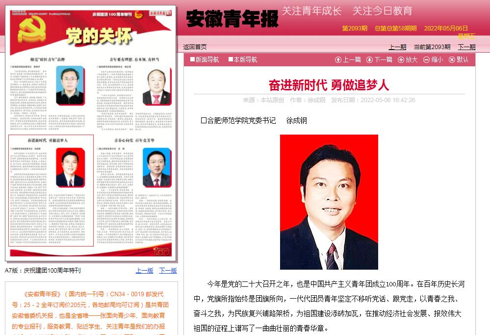 本网讯 5月6日,《安徽青年报》刊发庆祝建团100周年特刊,学院党委书记徐成钢教授以《奋进新时代 勇做追梦人》为题发表署名文章。文章刊发于《安徽青年报》“庆祝建团100周年特刊”(第2093期A7版)。(院团委)
