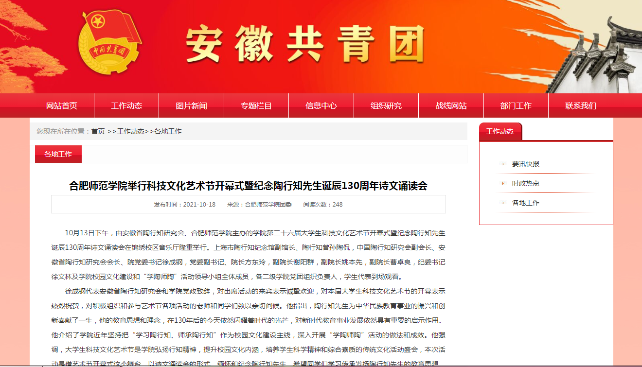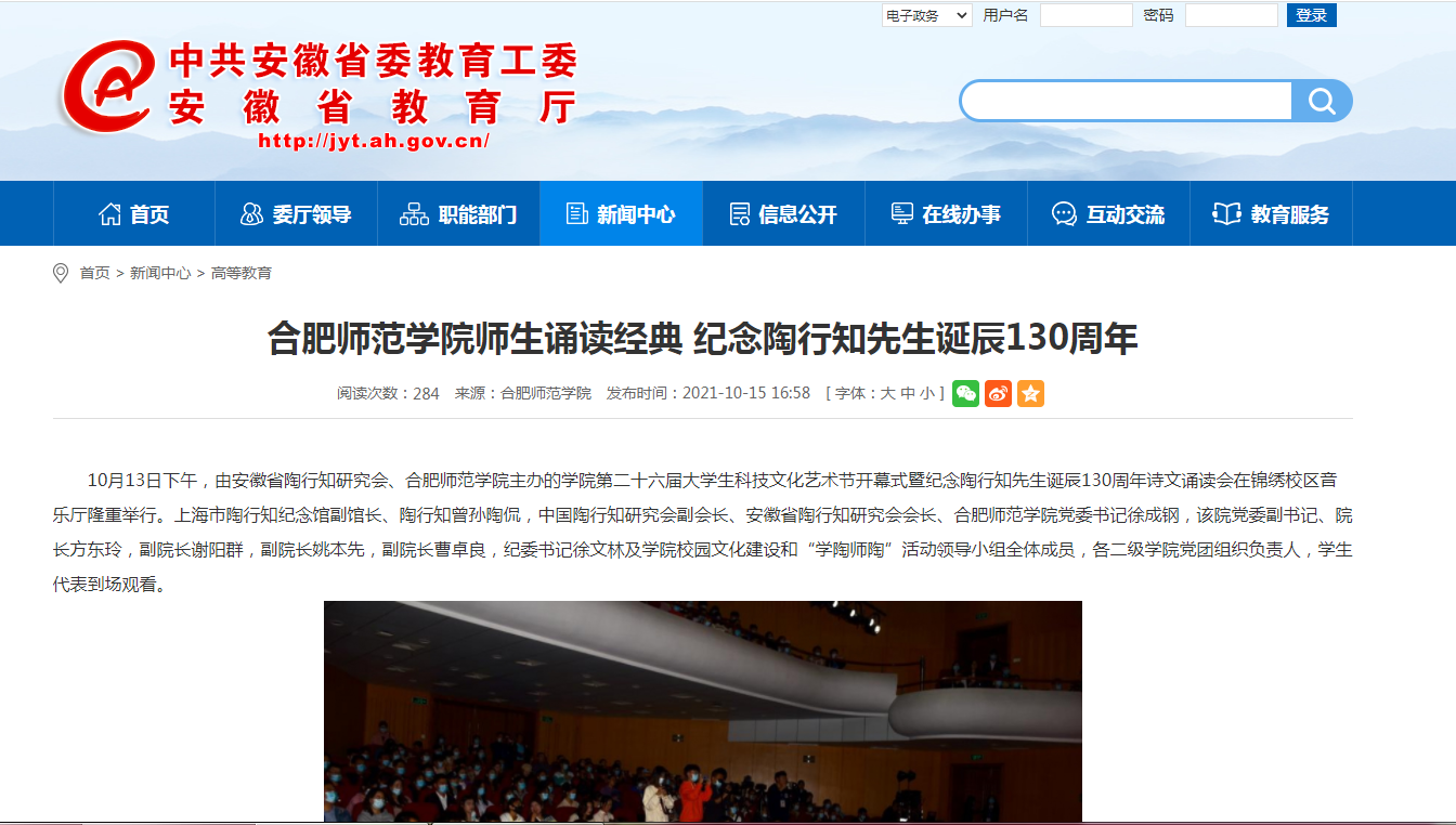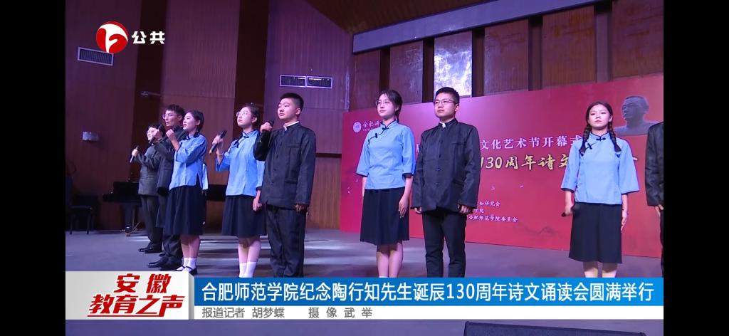 本网讯 10月13日下午,由安徽省陶行知研究会、beat365唯一官方网站主办的院第二十六届大学生科技文化艺术节开幕式暨纪念陶行知先生诞辰130周年诗文诵读会在锦绣校区音乐厅隆重举行。安徽电视台公共频道、《新安晚报》、安徽网、安徽教育网、安徽共青团网等媒体对此进行了报道。安徽电视台公共频道还采访了来院参加活动的上海陶行知纪念馆副馆长、陶行知曾孙陶侃和安徽省陶行知研究会会长、我院党委书记徐成钢。(省陶研会、院团委)