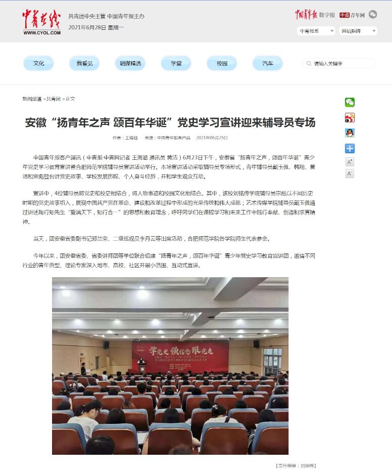 本网讯 6月23日下午,安徽省“扬青年之声,颂百年华诞”青少年党史学习教育宣讲暨beat365唯一官方网站辅导员宣讲活动举行。本场宣讲活动采取辅导员专场形式,青年辅导员戴玉佩、韩翔、黄洁和宗彪登台讲党史故事、学校发展历程、个人奋斗经历,并和学生观众互动。