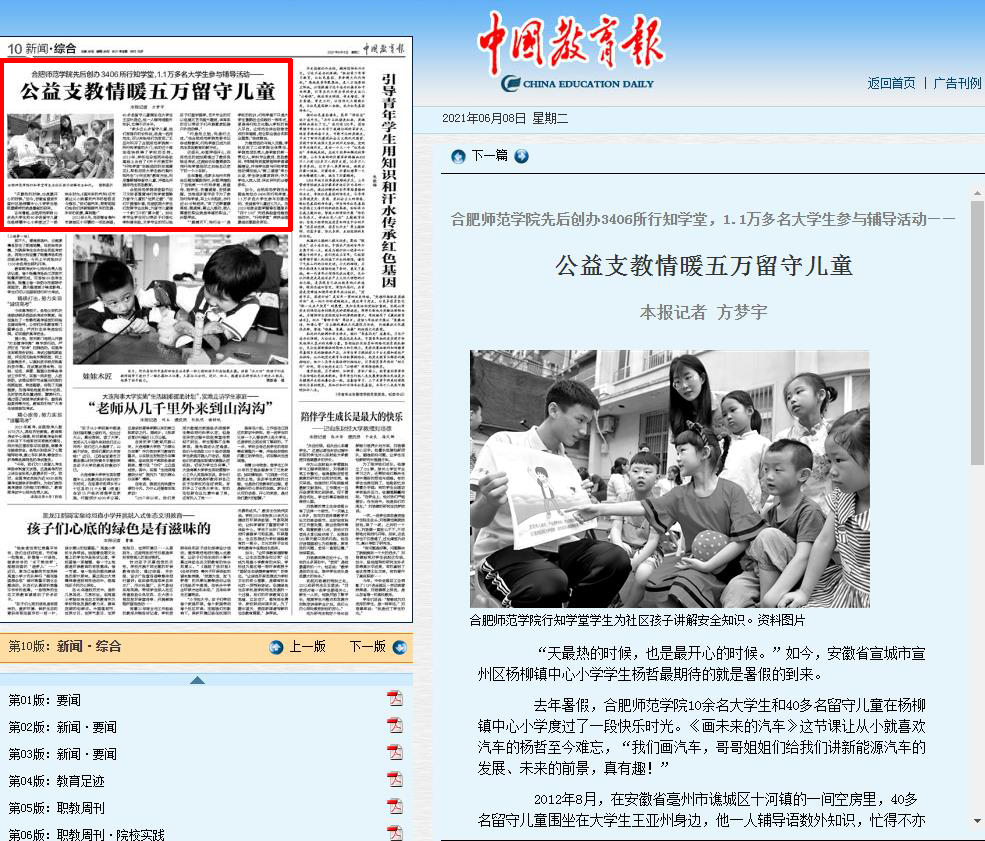 本网讯 6月8日,《中国教育报》在第10版以《公益支教情暖五万留守儿童》为题,专题报道了我院“行知学堂”实践活动。