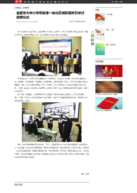 本网讯 4月22日,我院马克思主义学院指导瑶海区中小学成立区域大中小学思政课一体化联盟,并举行授牌仪式。此举是落实教育部“十四五时期加速推进大中小学思政课一体化建设”的积极举措,有利于促进区域内大中小学之间的沟通交流,促进互相学习、相互借鉴。有利于打破学段隔膜,明晰思政一体化建设的整体框架,构建不同学段“协同作战“的思政课教育体系,推动思政课建设内涵式发展,积极营造全党全社会努力办好思政课、教师认真讲好思政课、学生积极学好思政课的良好氛围。