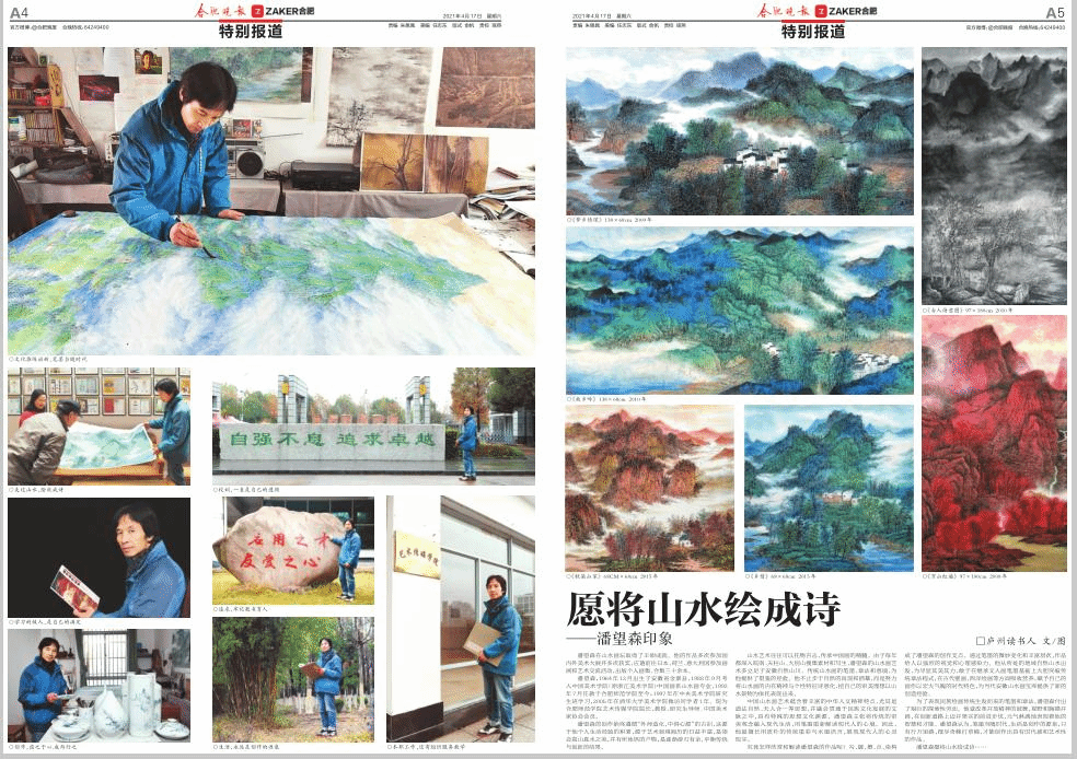 本网讯 4月17日,合肥晚报以两个版面的篇幅推出特别报道,对beat365唯一官方网站艺术传媒学院院长、教授、硕士生导师潘望森的个人画作和教书育人以《愿将山水绘成诗》为题进行了报道。
