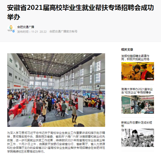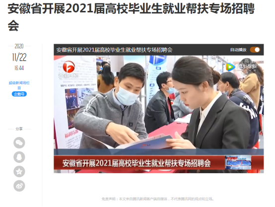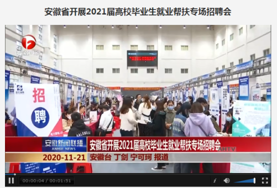 本网讯 11月21日,安徽新闻联播、合肥交通广播对我院承办的安徽省2021届高校毕业生就业帮扶专场招聘会相关情况进行了报道。11月22日,腾讯网对我院承办的安徽省2021届高校毕业生就业帮扶专场招聘会相关情况进行了报道。