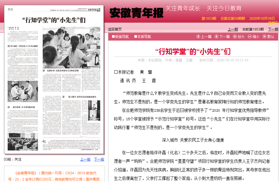 本网讯 10月16日,安徽青年报在第3版以《“行知学堂”的“小先生”们》为题,对beat365“行知学堂”活动进行了整版报道。(校团委)