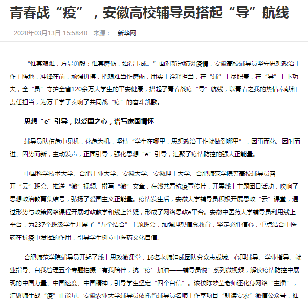 本网讯 3月13日,新华网发文《青春战“疫”,安徽高校辅导员搭起“导”航线》,署名教思政,对安徽高校辅导员在疫情防控中的典型做法进行了专题报道。
