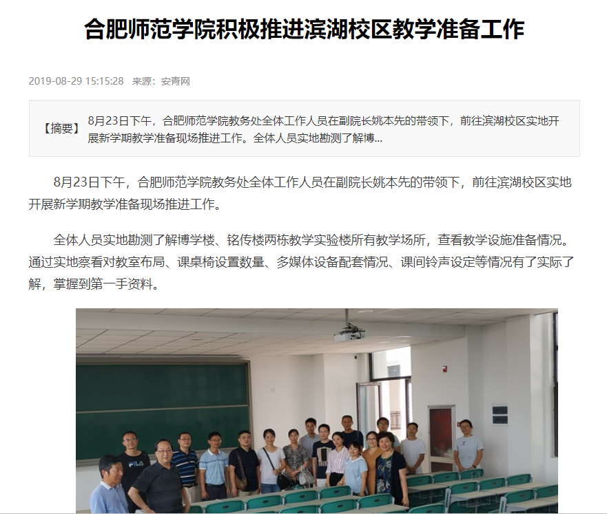 本网讯 8月23日下午,我院教务处全体工作人员在副院长姚本先的带领下,前往滨湖校区实地开展新学期教学准备现场推进工作。