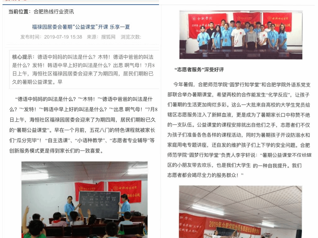 本网讯 7月8日上午,我院“圆梦行知学堂”和合肥学院外语系党支部联合在海恒社区福禄园居委会举办“暑期公益课堂”。早在一个月前,五花八门的特色课程就被家长们“瓜分完毕”。“自主选课”、“小语种教学”、“志愿者专业辅导”等创新服务模式更是得到家长们的一致喜爱。