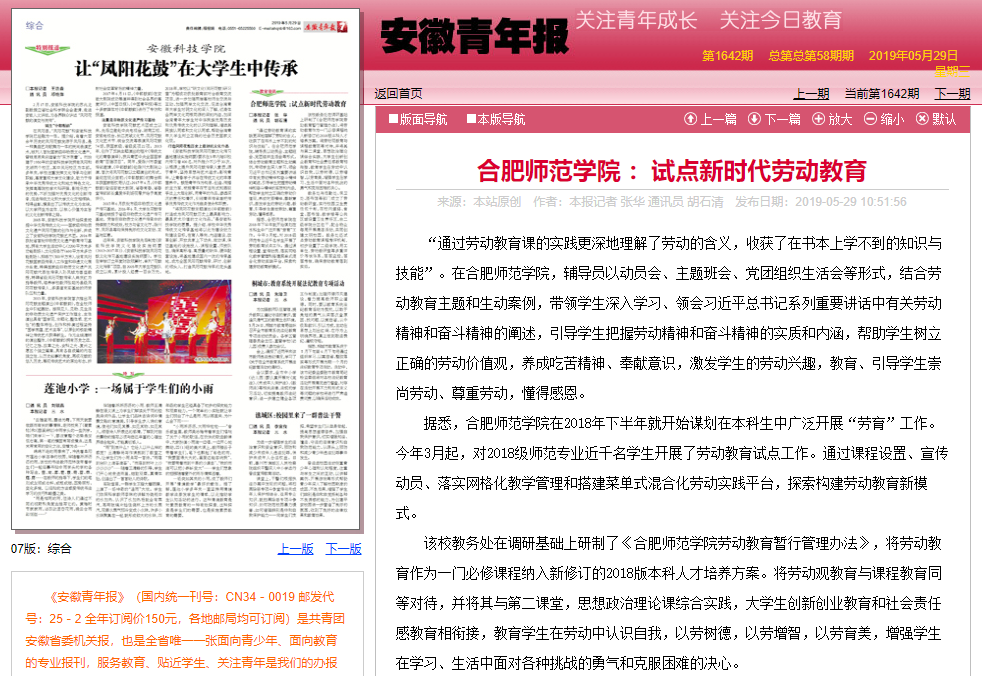 据悉,《合肥新闻联播》、《安徽青年报》也先后对我院探索开展师范生劳动教育进行了相关报道。(新闻中心:夏晓璐)