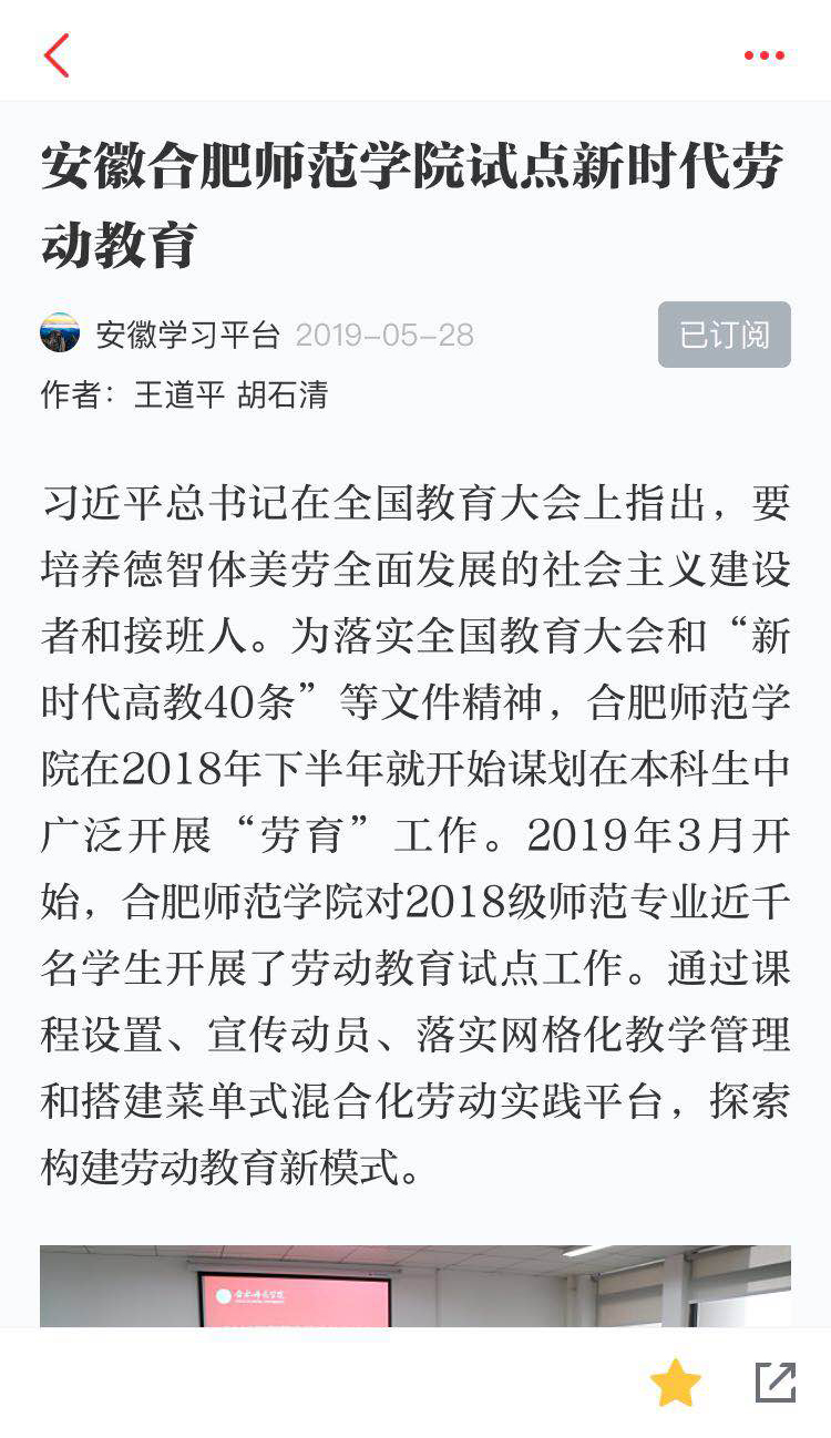 本网讯 5月28日,中共中央宣传部“学习强国”平台以《安徽beat365唯一官方网站试点新时代劳动教育》为题,在“创新安徽”栏目转载了我院探索开展师范生劳动教育新闻,再度引发社会各界的广泛点赞和转发。