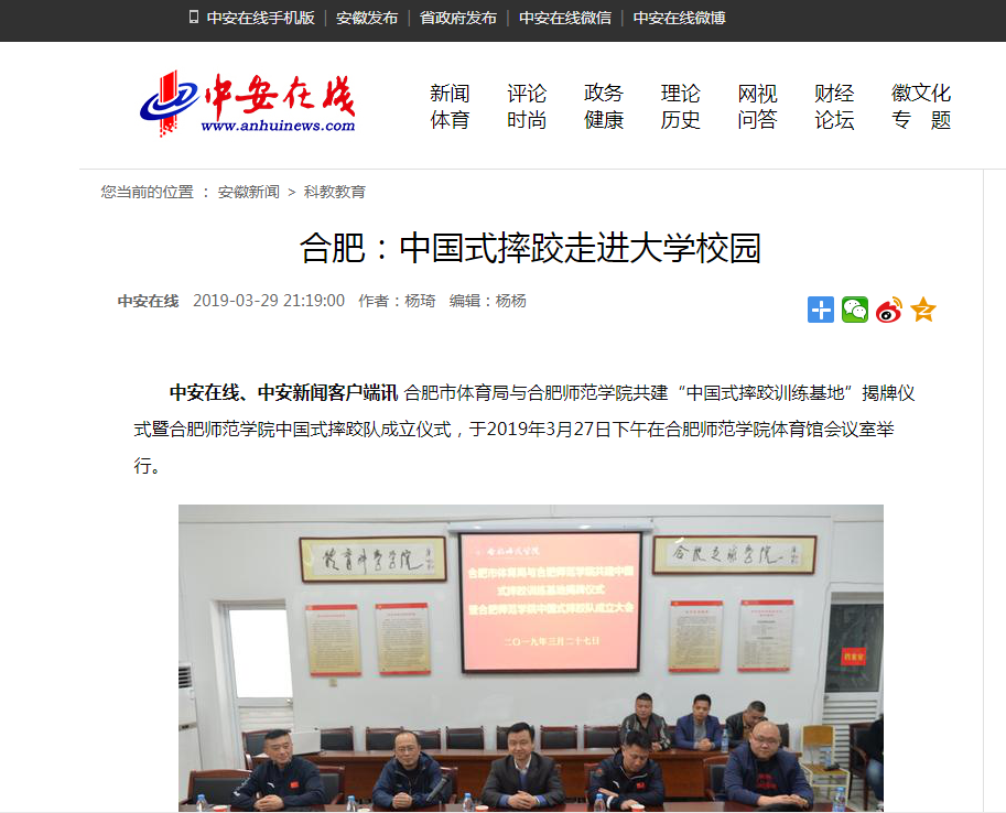 本网讯 3月27日下午,合肥市体育局与我院共建中国式摔跤训练基地揭牌仪式暨beat365唯一官方网站中国式摔跤队成立大会在我院举行。院党委副书记、院长孙道胜,合肥市体育局副局长陆志勇,合肥市体育局竞技处葛伟,省体育局举摔柔中心摔跤队领队王晓伟,合肥市中国跤协会秘书长王朝斌,体育科学学院院长宋旭、党总支书记杜文龙、副书记王飞,及中国式摔跤队教练员代表、运动员代表出席揭牌仪式并见证beat365唯一官方网站中国式摔跤对成立。中安在线3月29日对此进行了报道。