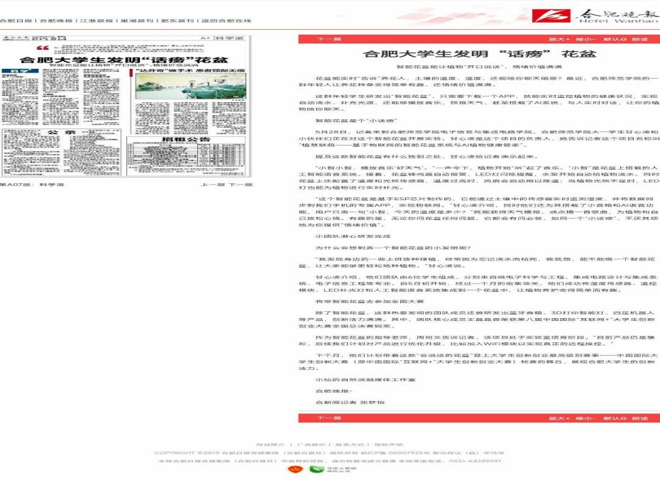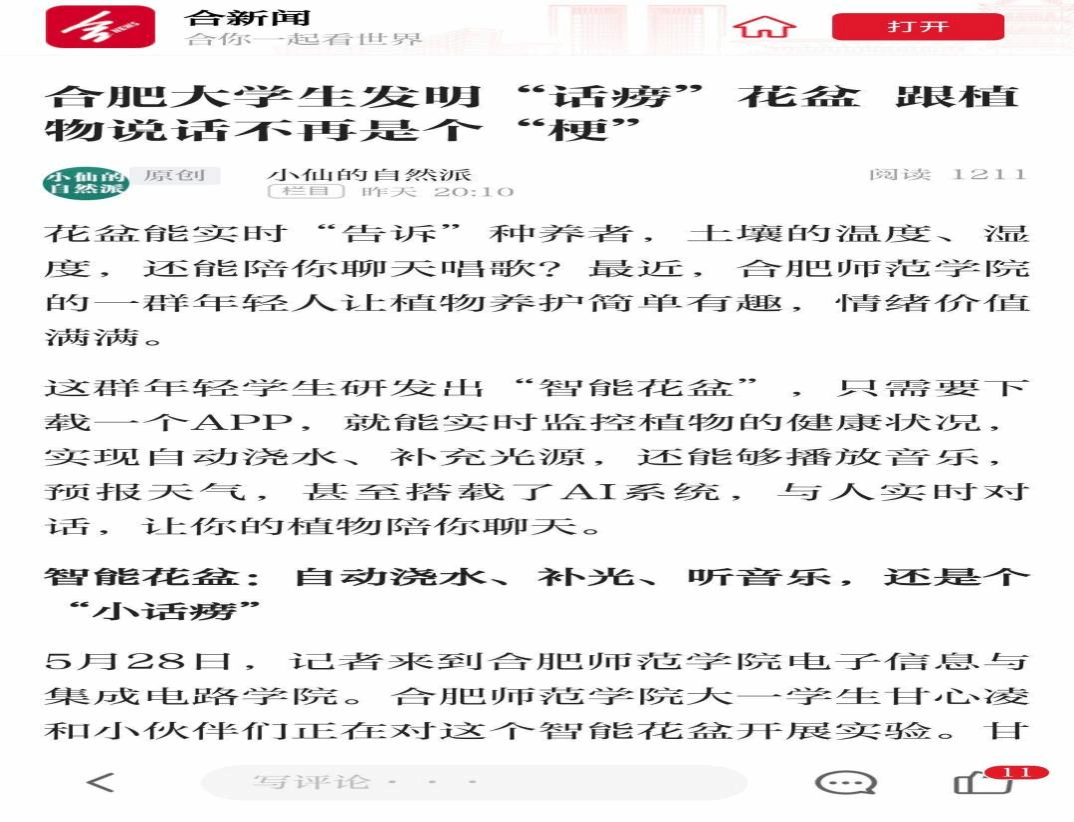 近日,电子信息与集成电路学院学生团队研发的“植慧联萌——基于物联网的智能花盆系统与AI植物健康管家”项目获得《合肥晚报》专题报道,展现了beat365学子的创新活力与专业素养。