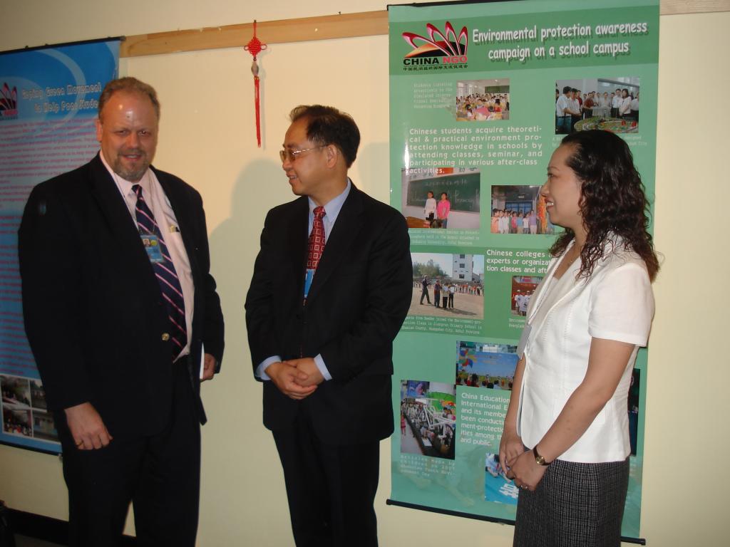 (2007年9月,杨善竑参加联合国会议并向联合国官员介绍她制作展出的我国大中小学校环境教育展板)