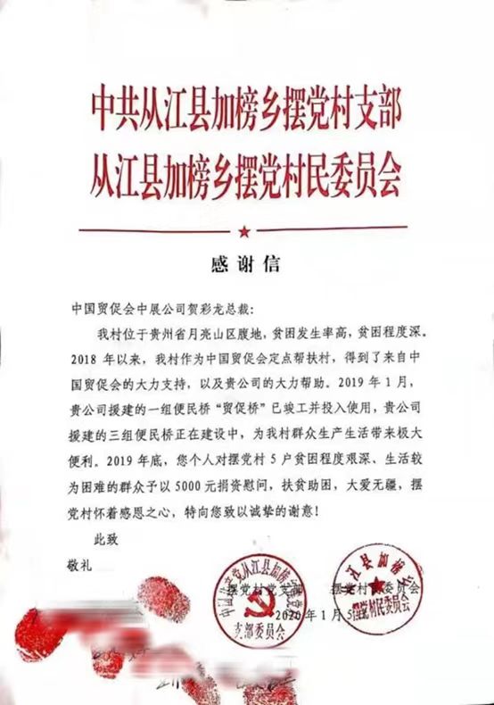贸促会有力帮扶,助力从江如期脱贫。高武村被中央文明委授予第六届全国文明村镇称号,第一书记刘伟男获“全国脱贫攻坚先进个人”称号。从江县加榜乡党委、政府2018年给中展集团送来“精准扶贫 扶志扶智”的锦旗,从江县人民政府2019年又送上“用心用情用力 扶业扶智扶贫”的锦旗。2020年1月,摆党村两委和受其单独资助的群众给贺彩龙发来感谢信,向他致以诚挚的谢意。(发展规划处(校友办))