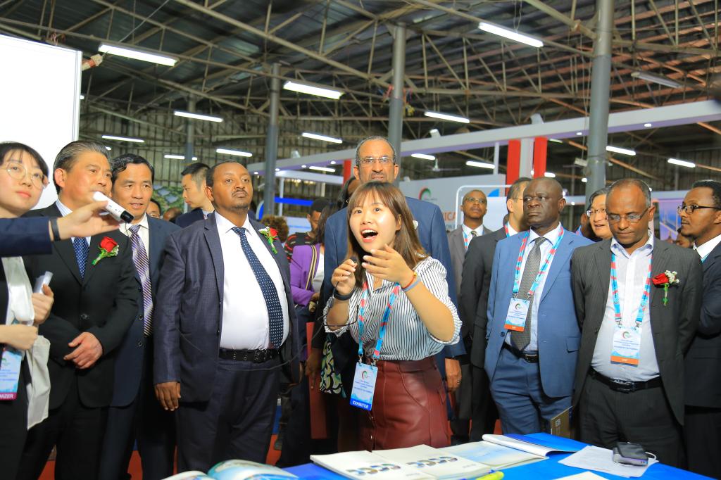 (2019年10月22日贺彩龙(左三)陪同中国贸促会副会长张慎峰、中国驻非盟使团团长刘豫锡大使和埃塞贸工部副部长塔卡、投资局副局长特玛罕、商会会长埃泽泽、非盟贸工部顾问布瑞弗维等参观展会)