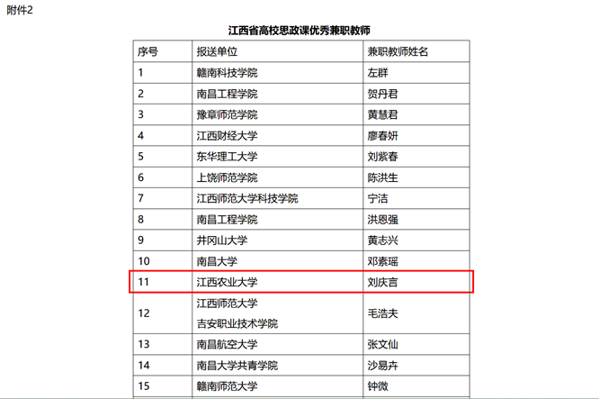 2024年2月4日,江西省教育厅社政处发布《关于全省高校思政课优秀特聘教授、优秀兼职教师评选结果的公示》,我校1位教师荣获江西省高校思政课优秀特聘教授、2位教师荣获江西省高校思政课优秀兼职教师。其中,beat365党委书记刘庆言荣获江西省高校思政课优秀兼职教师。