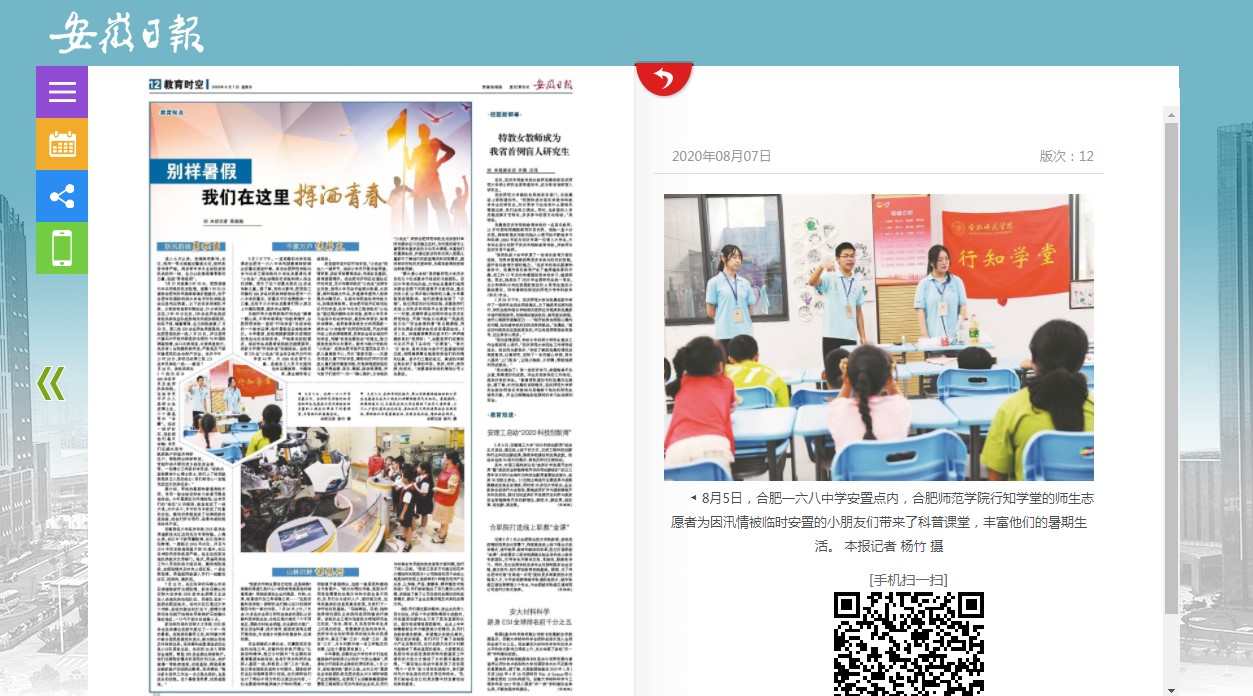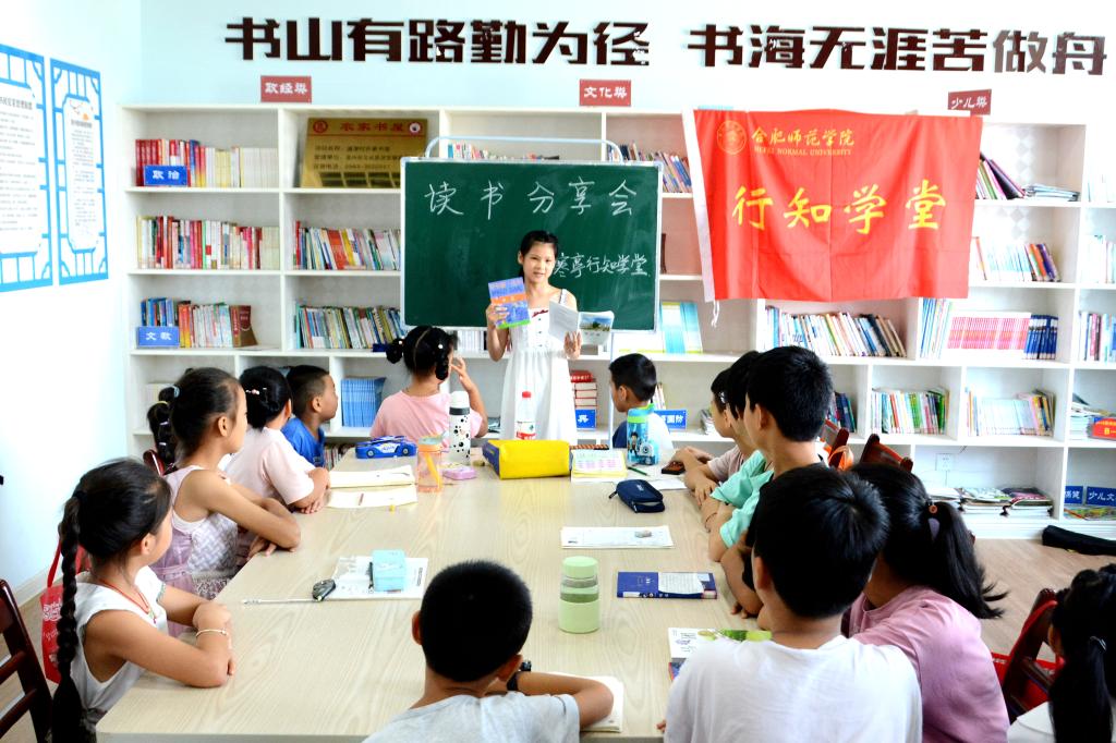 校团委连续第五年在宣城市宣州区开办乡村行知学堂,结合村委会、中心学校、群团资源,因地制宜的开设理论教学和实践教学,18名宣城籍“小先生”开办4所学堂服务农村留守儿童300余人。学生工作部大学生“青春学习营”连续第二年开办行知学堂,在宿州市埇桥区紫金社区,4名不同专业的宿州籍“小先生”开设计算机、美术、英语等课程,丰富留守儿童假期生活。文学院旌德县北门行知学堂“小先生”利用应用心理学专业优势,为农村留守儿童提供心理健康评估、心理咨询、心理治疗介入等服务,运用团群辅导等方法开展小组课程,为农村留守儿童的心理健康保驾护航。教师教育学院肥东县店埠镇古河行知学堂开设传习经典、安全教育、素质拓展、手工作品、趣味科普、心理辅导等系列课程,全面、综合地助力“小学员”健康成长。生命科学学院在宿州市泗县刘圩镇四山村开办智才行知学堂,通过生动有趣的形式,为乡村中小学生的英语词汇、语法、口语水平的提升带来了帮助。