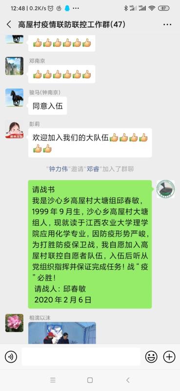 “我是沙心乡高屋村大塘组邱春敏,1999年9月生,沙心乡高屋村大塘组人,现就读于江西农业大学理学院应用化学专业,因防疫形势严峻,为打胜防疫保卫战,我志愿加入高屋村联控志愿者队伍,听从党组织指挥并保证完成任务。”这是我校应化1702班的邱春敏同学用微信向赣州市于都县沙心乡高屋村村干部发出的请战申请书。疫情来袭,村里建立联防联控工作组急需青年志愿者,邱春敏第一时间请战,在村干部的带领下工作在联防联控一线,主要负责疫情排查、防控宣传及守卡工作。
