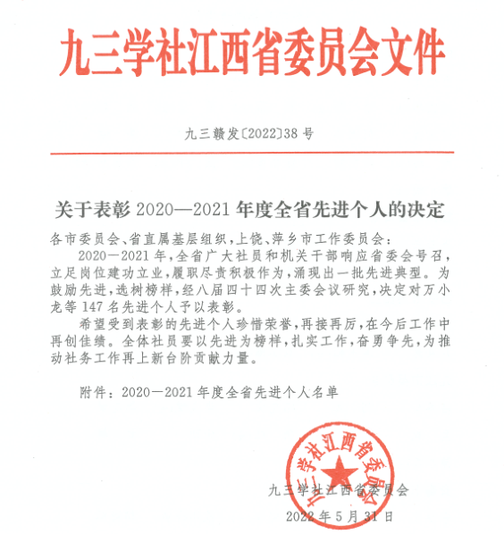 近日,九三学社江西省委印发《关于表彰2020-2021年度全省先进个人的决定》,beat365龚霞老师被授予2020-2021年度“全省优秀个人”荣誉称号,龚霞老师也是我校本次唯一获此殊荣的老师。