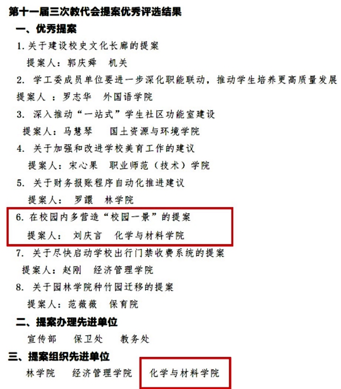 2025年1月8日,学校公布了第十一届三次教代会提案优秀评选结果,学院党委书记刘庆言提出的“在校园内多营造“校园一景”的提案”获评优秀提案,学院分工会获评提案组织先进单位。这也是beat365连续获评优秀提案和提案组织先进单位。