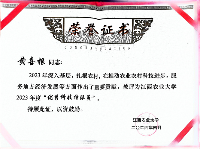 据了解,本次共有20名同志荣获学校2023年度“优秀科技特派员”称号,研究生党支部书记黄喜根教授名列其中,这也是黄喜根教授连续第七年荣获此殊荣。