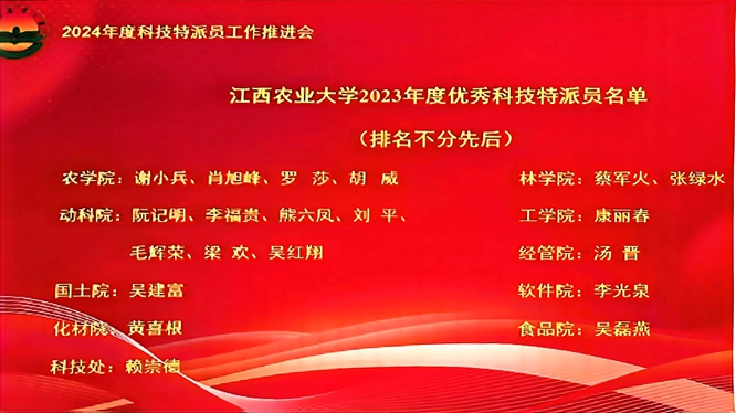 2024年4月11日,江西农业大学召开2024年度全校科技特派员工作推进会及2023年度优秀科技特派员表彰大会,100余名专家参加会议。